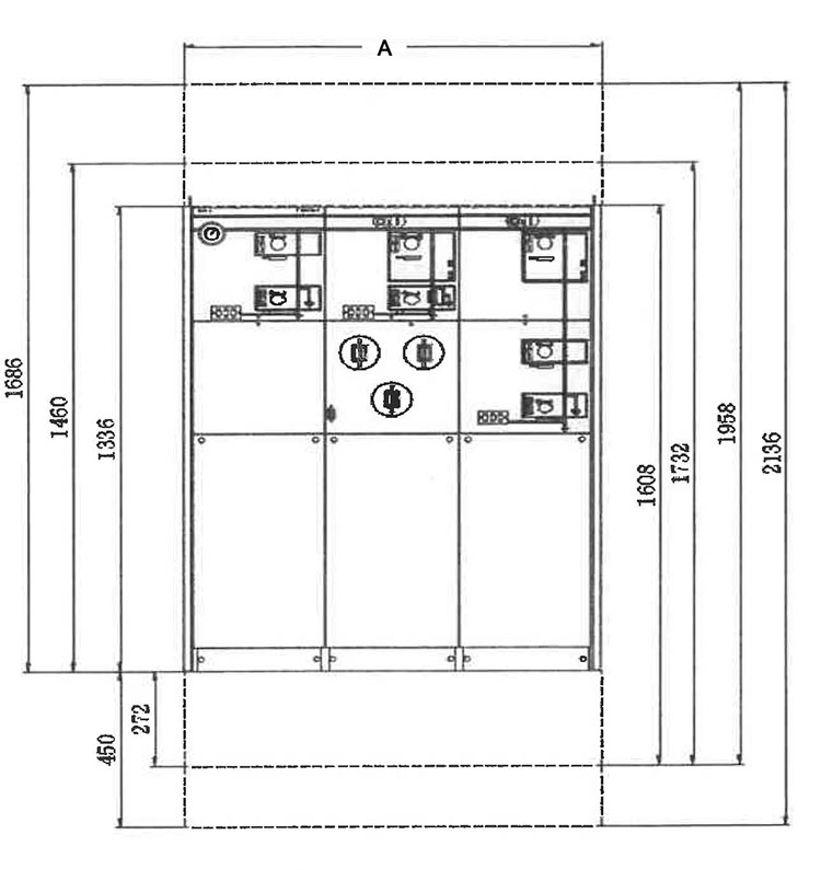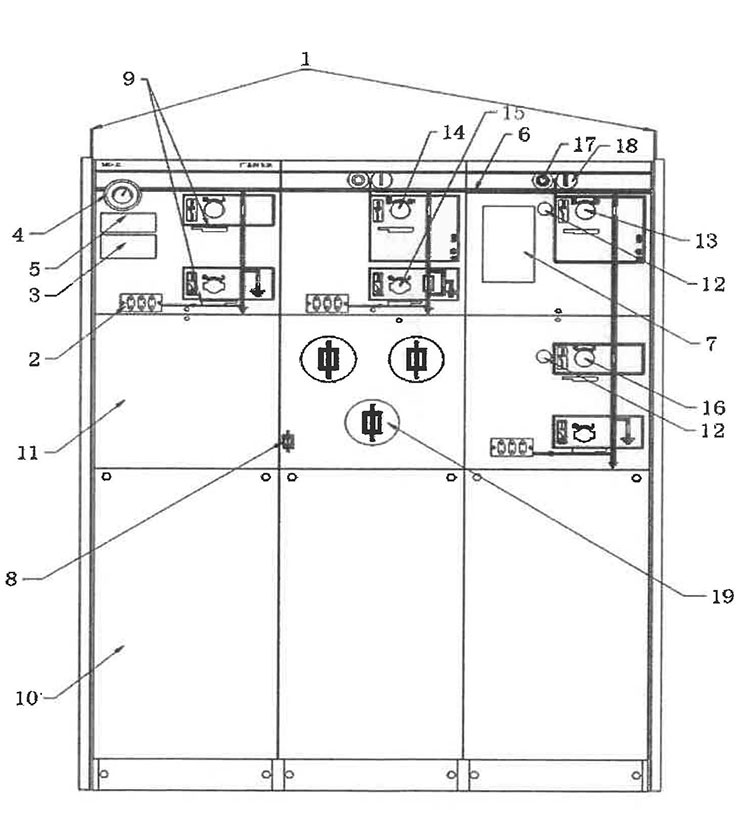 Je to podobné jako aAir izolovaný rozváděč že hlavním spínačem a jističem ve vstupním a výstupním panelu je spínač uzemnění, přepínač odpojení, vypínač zatížení a vakuový jistič pro řízení a ochranu napájecích systémů.