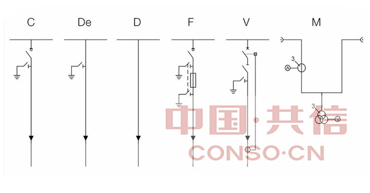 TheHlavní jednotka prstence SF6 Má hlavně C (panel kabelového přepínače), V (vakuový obvod jistič), D (přímý připojení kabelu), DE (přímé připojení kabelu s uzemňovacím panelem), F (panel odpojení přepínače) a M (měřicí panel).